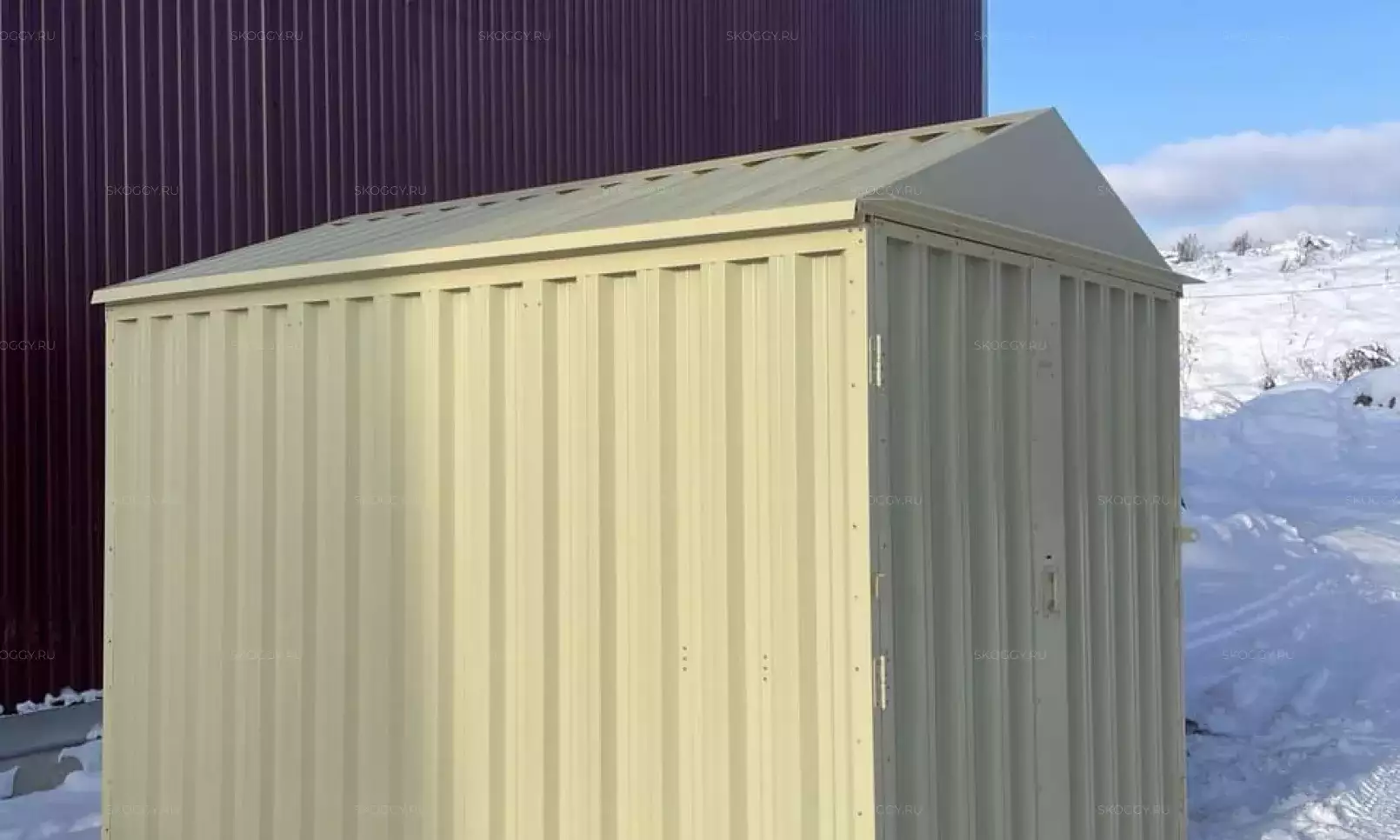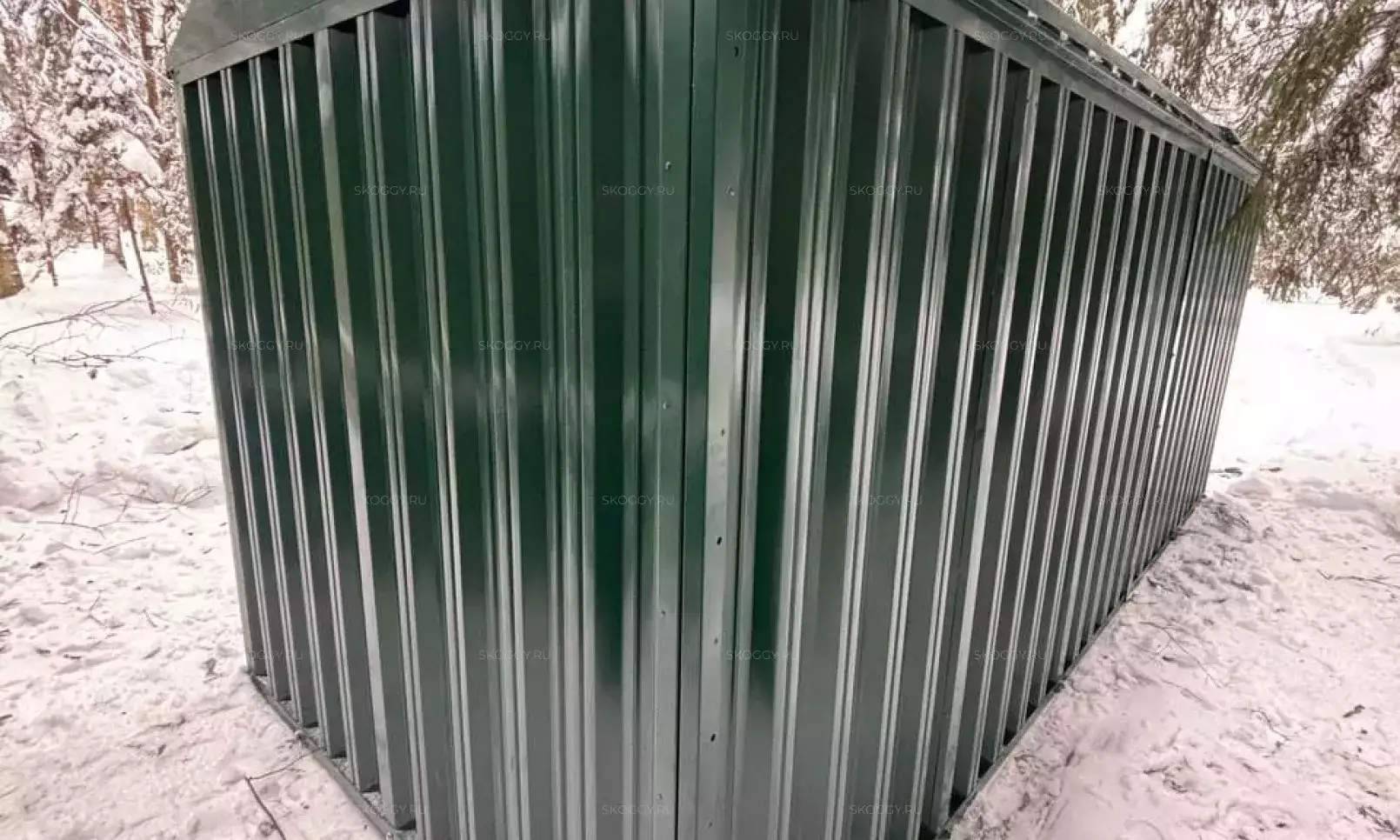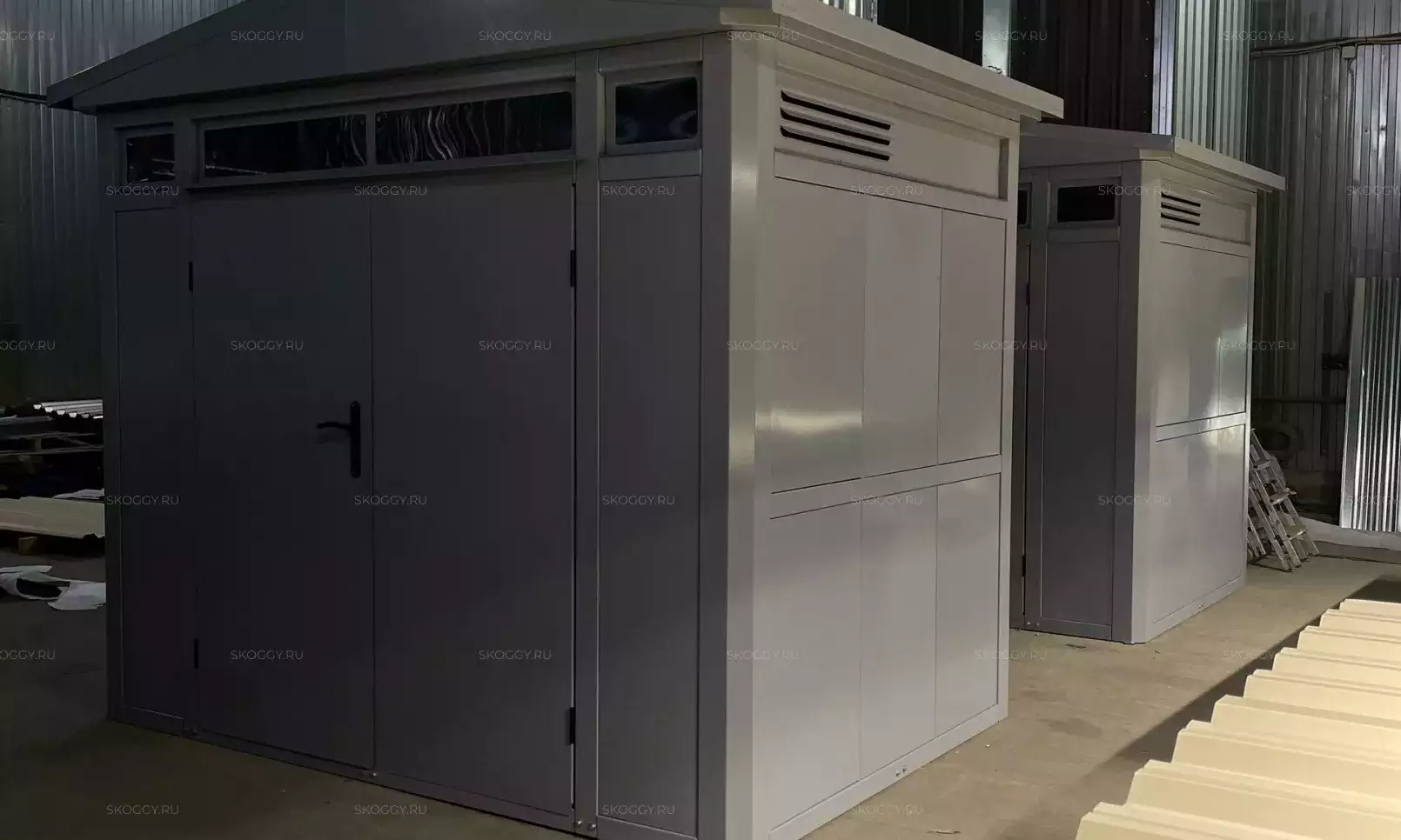 Изготовили конструкцию с двускатной крышей с увеличенной шириной 4,22 м и длиной 2,5 м. Окрас постройка получила в шоколадный цвет 8017 по каталогу RAL.