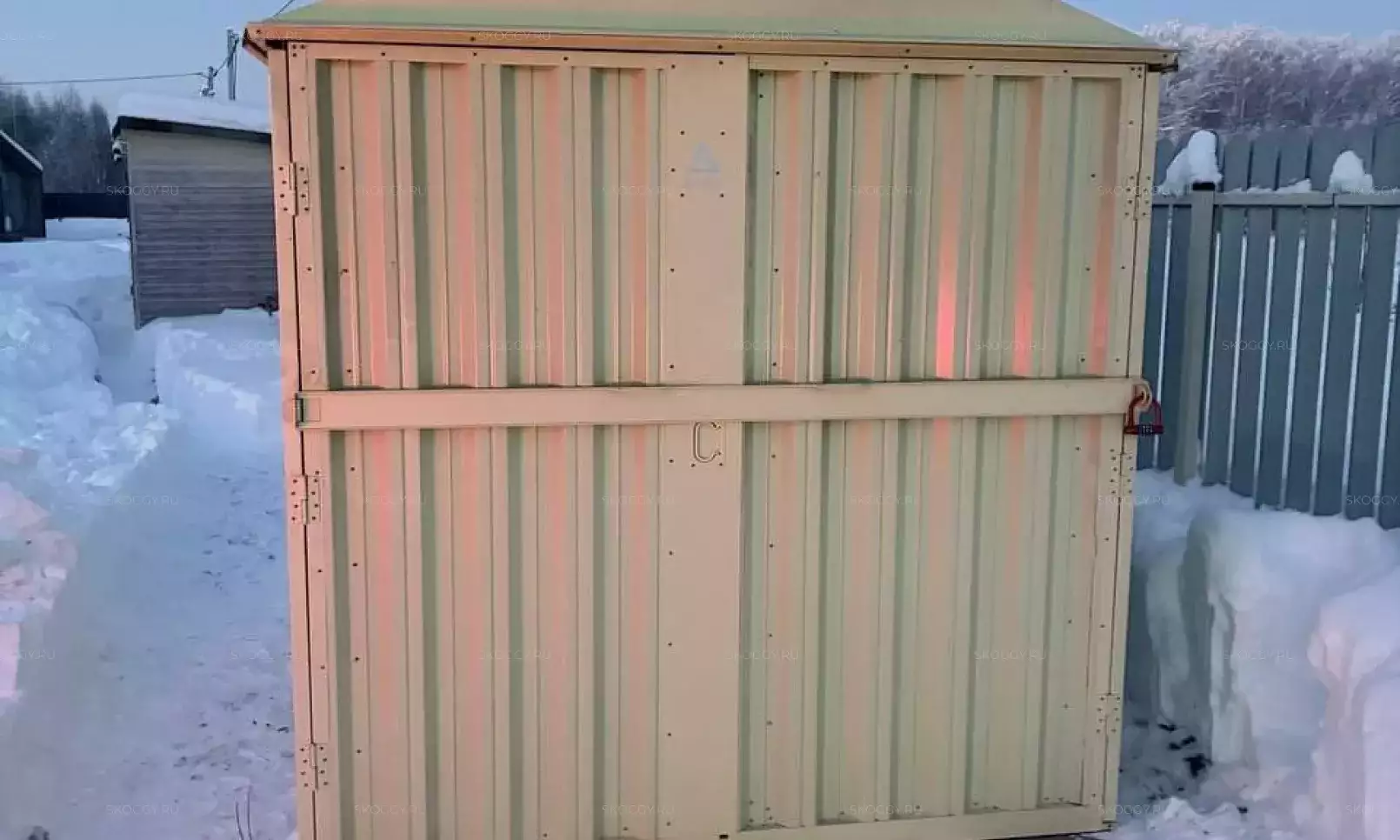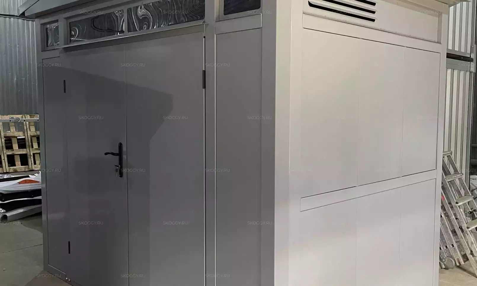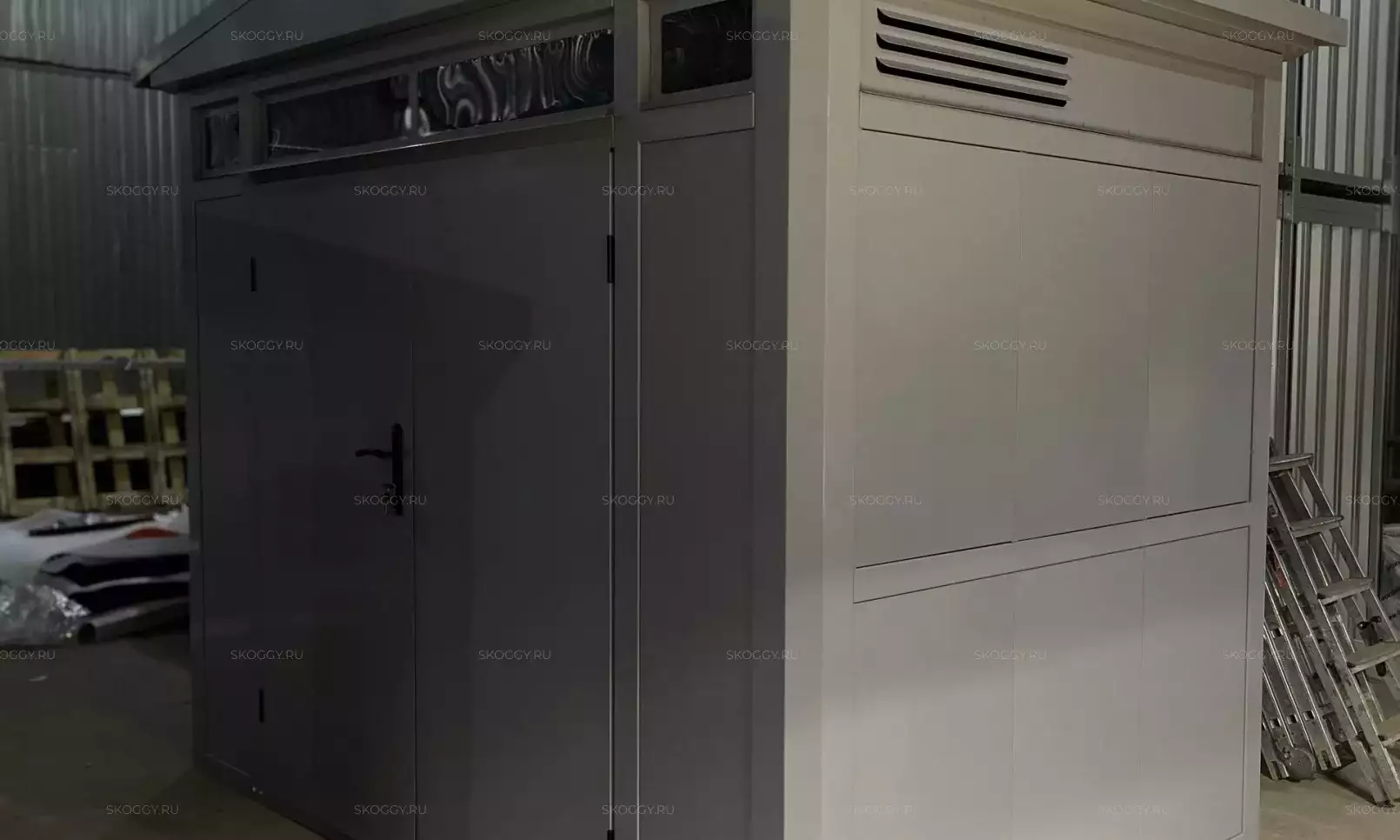 Изготовили конструкцию с двускатной крышей с увеличенной шириной 4,22 м и длиной 2,5 м. Окрас постройка получила в шоколадный цвет 8017 по каталогу RAL.