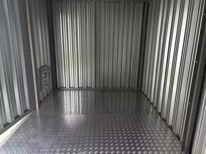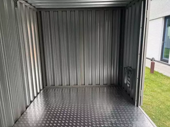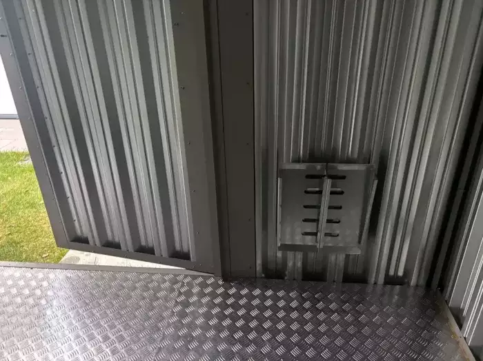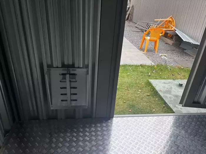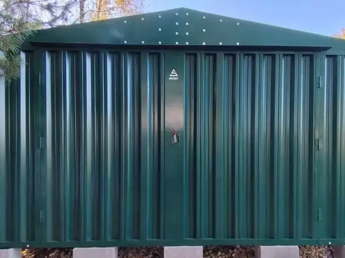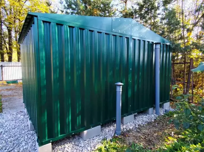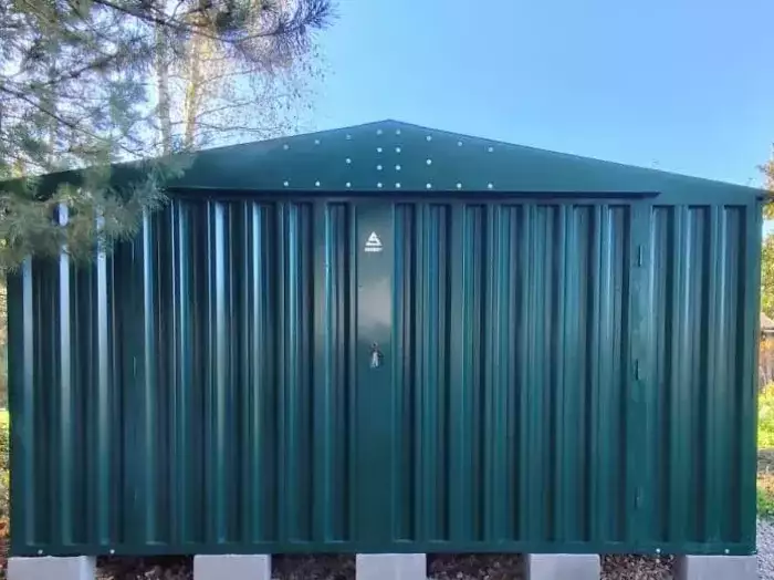 Проект: 5-метровый хозблок для хранения садового инвентаря в ярком зеленом цвете.