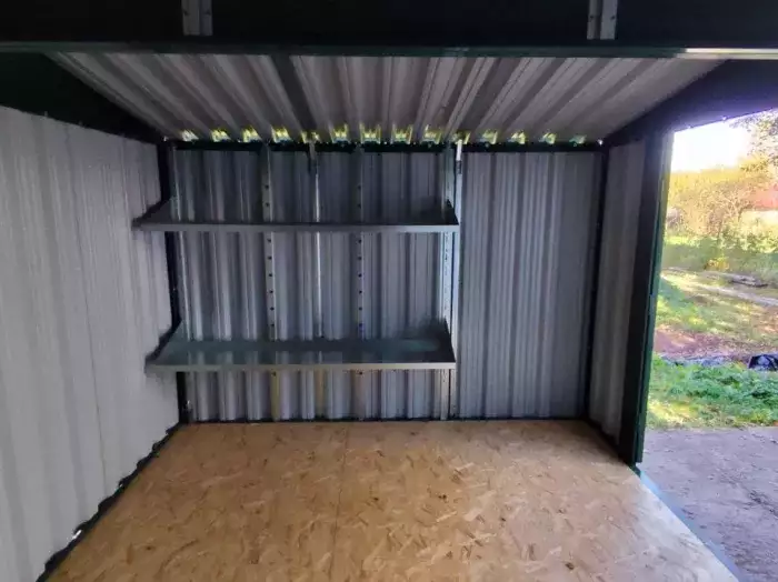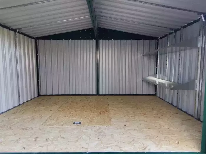 Нами была изготовлена 5-метровая конструкция с односкатной крышей и торцевой воротной группой в сочном зеленом цвете RAL 6005.