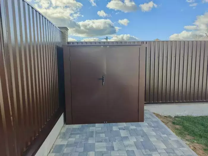 Нами была изготовлена стандартная 3-метровая конструкция с плоской крышей и торцевой воротной группой в блестящем цинковом цвете.