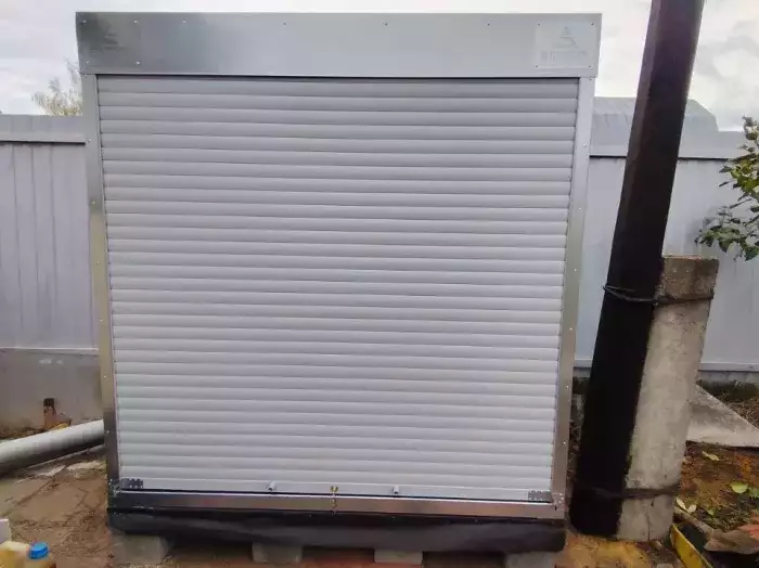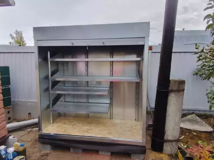 Дополнительно хозблок оборудован входной дверью с торцевой стороны, металлическим полом, прямым стеллажом, угловым стеллажом, а также тремя световыми окнами размером 90 х 30 см.