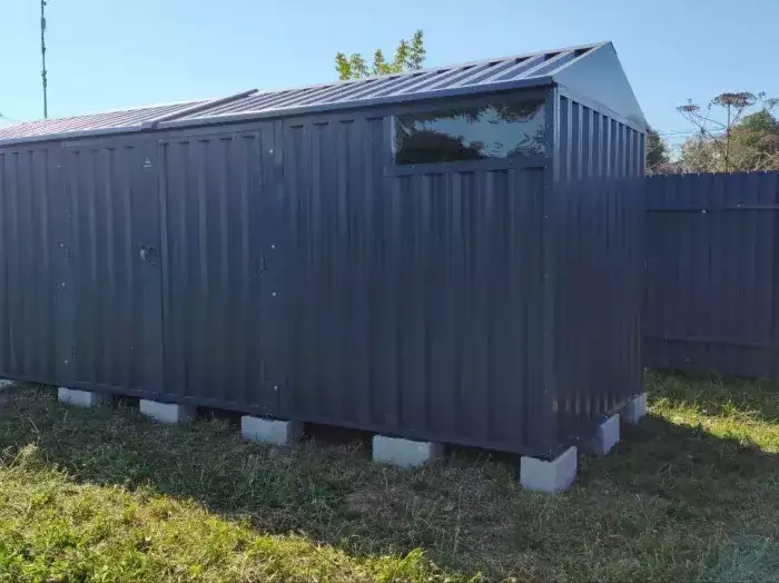 Гараж установили на блоки. Конструкция очень удачно вписалась в дизайн участка и радует своего хозяина своим элегантным видом. А Дарт Вейдер не только охраняет участок, но и готов сражаться с крапивой и прочими сорняками :)