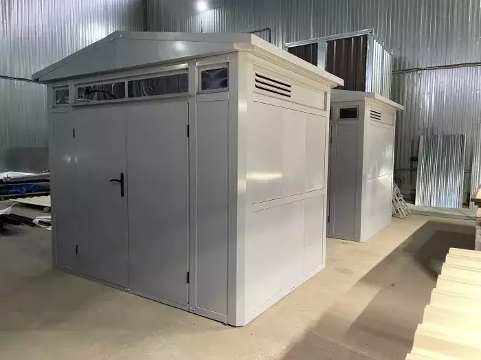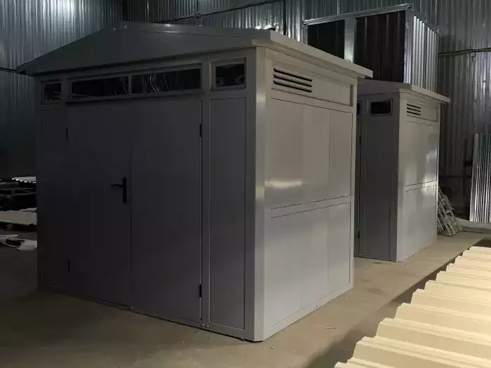 Нами была изготовлена 4-метровая секционная конструкция с плоской крышей и торцевой воротной группой в блестящем цинковом цвете.