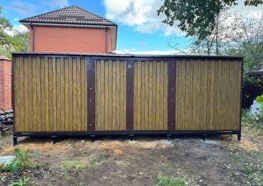 Нами была изготовлена широкая 6-метровая конструкция с двускатной крышей и боковой воротной группой в стильном шоколадно-коричневом цвете RAL 8017. На лицевую сторону изделия дополнительно был нанесен потрясающий принт «под дерево» Дуб 3Д по акции с приятной скидкой.