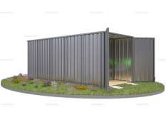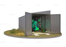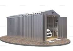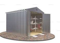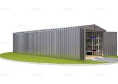 • Гибкая планировка. Железные модули отличаются универсальностью и способностью подстроиться под любые задачи. Например, возможна установка широких ворот с двух сторон конструкции; разделение пространства на зоны с помощью дополнительных перегородок; врезка слуховых окошек или же обустройство полноценных проёмов с рамами.